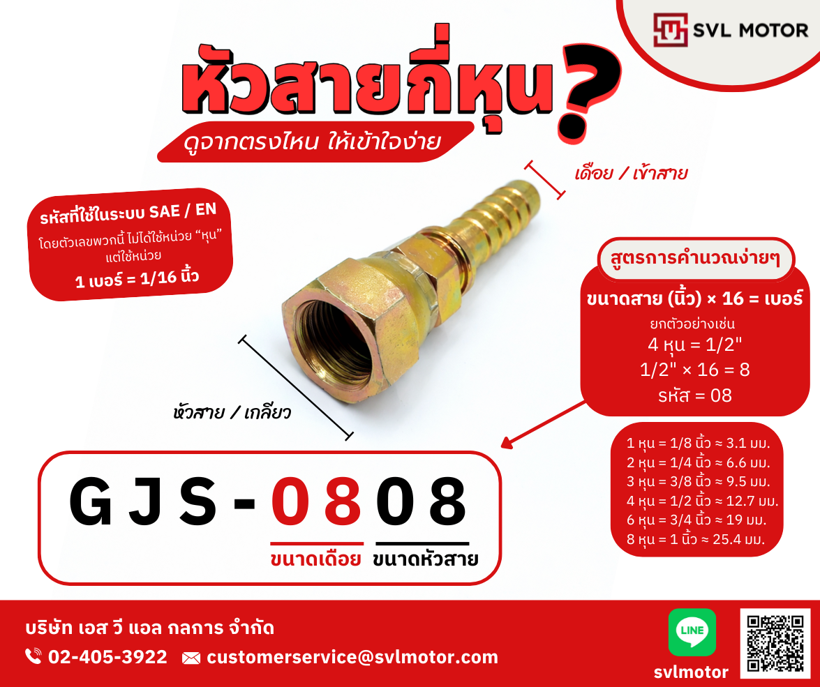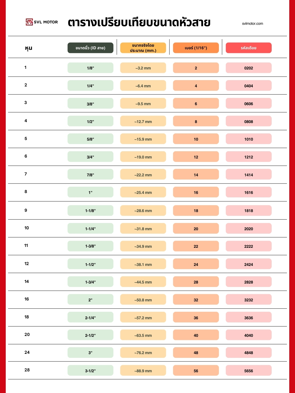 และถ้าถามว่า SVL ทำหัวสายไฮดรอลิคได้ถึงขนาดเท่าไหร่ ขอตอบเลยว่าตั้งแต่ 1/8" (0202) จนไปถึง 3.5" (5656) เลยครับ